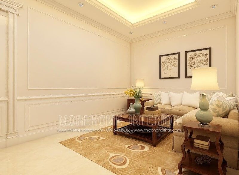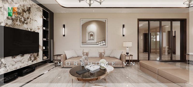 Mẫu bàn trà chân sắt thiết kế lạ mắt kết hợp mặt bàn bằng đá nhân tạo màu trắng, mang đến sự hiện đại đẳng cấp cho phòng khách biệt thự
