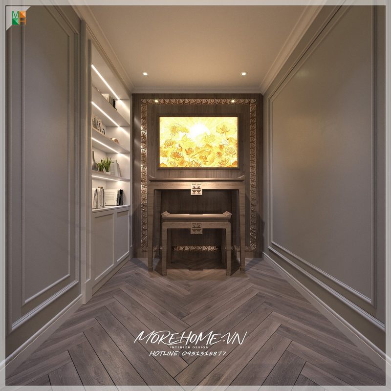 Thiết kế ấn tượng với họa tiết bàn thờ và kệ được đặt hai góc phòng điều khắc sắc xảo, chất liệu gỗ tự nhiên óc chó cao cấp sang trọng.