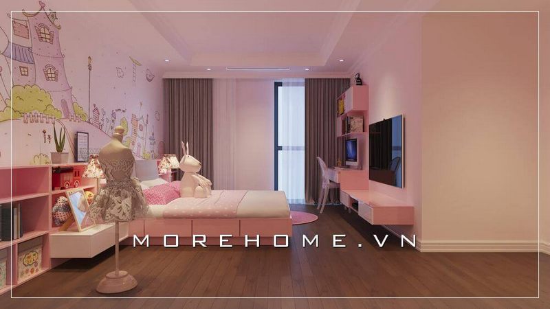 Thiết kế phòng ngủ bé gái màu hồng với những đồ nội thất gỗ công nghiệp hiện đại, đơn giản