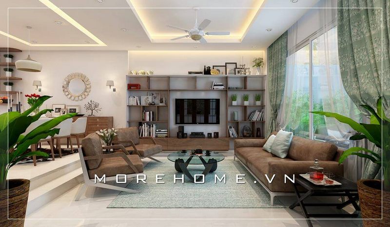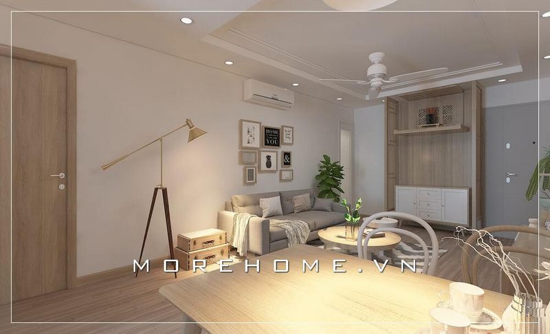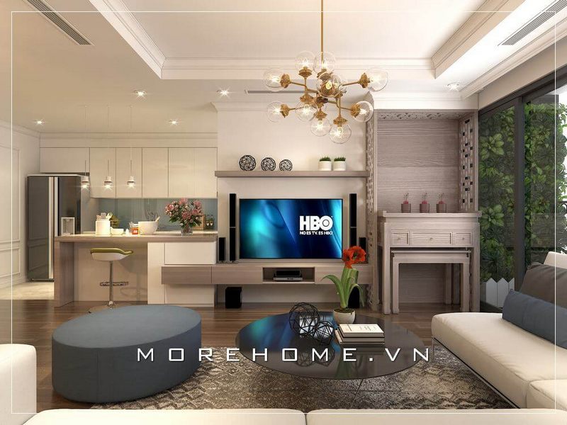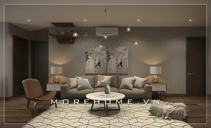 Sự tinh tế được các kiến trúc sư MoreHome thể hiện trong thiết kế nội thất phòng khách chung cư với cách sắp xếp đơn giản tạo sự thoáng đãng, thư thái