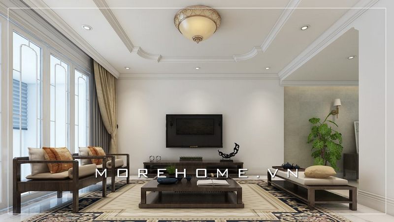 Cách trang trí phòng khách rất phù hợp và khoa học sử dụng mẫu kệ tivi tân cổ điển sắc trắng chủ đạo rất tinh tế tôn vẻ tiện nghi cho căn phòng ngủ.