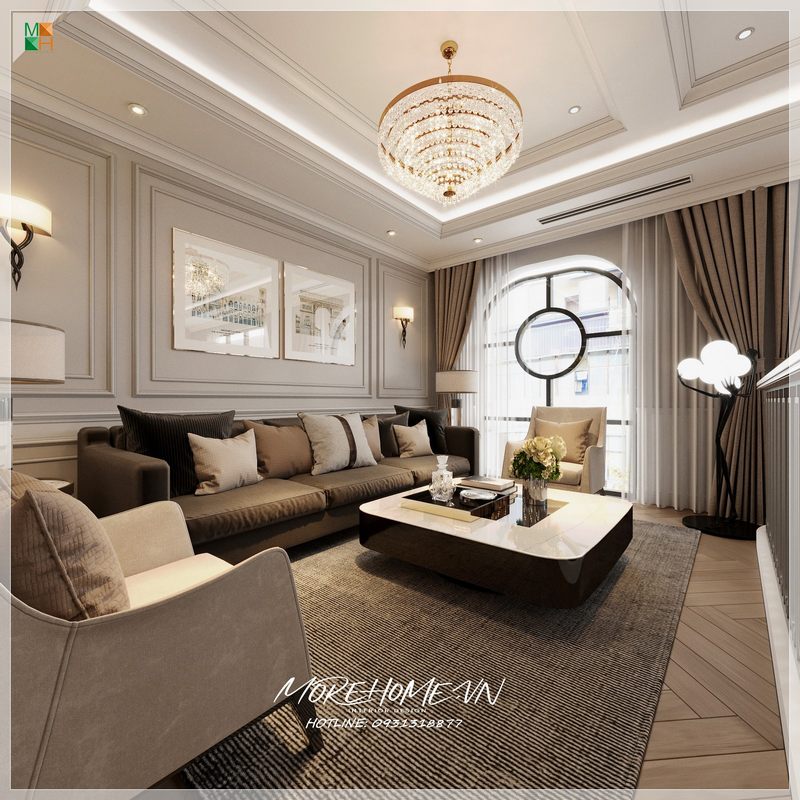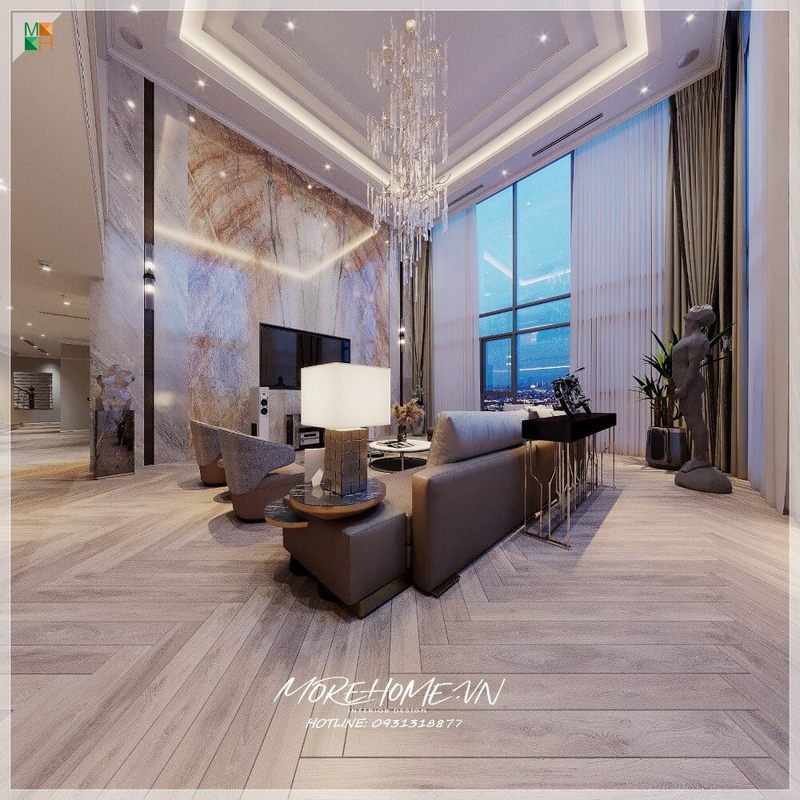 Thiết kế phòng khách sang trọng, hiện đại với đèn chùm kiểu cách, kết hợp ánh sáng tự nhiên từ hệ thống cửa kính ban công cánh lùa, mang đến không gian vô cùng thoáng đãng