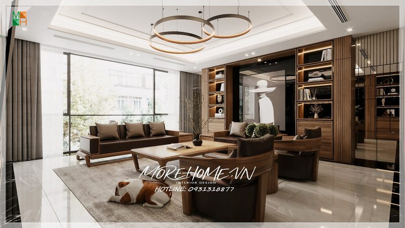 Thiết kế phòng khách gỗ óc chó cao cấp sang trọng cho biệt thự hiện đại tại Đông Anh Hà Nội