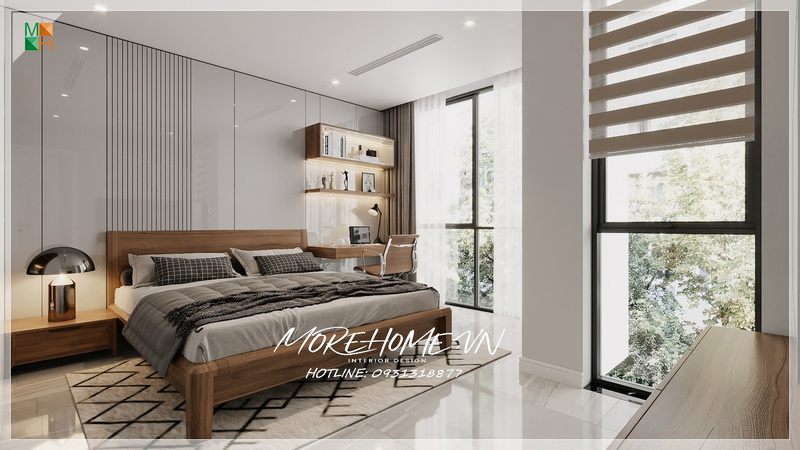 Giường Master của chúng ta được thiết kế sang trọng và đẳng cấp với khung giường gỗ óc chó chủ đạo. Màu trầm ấm của gam đã tạo nên một nét đồng bộ cho không gian căn phòng.