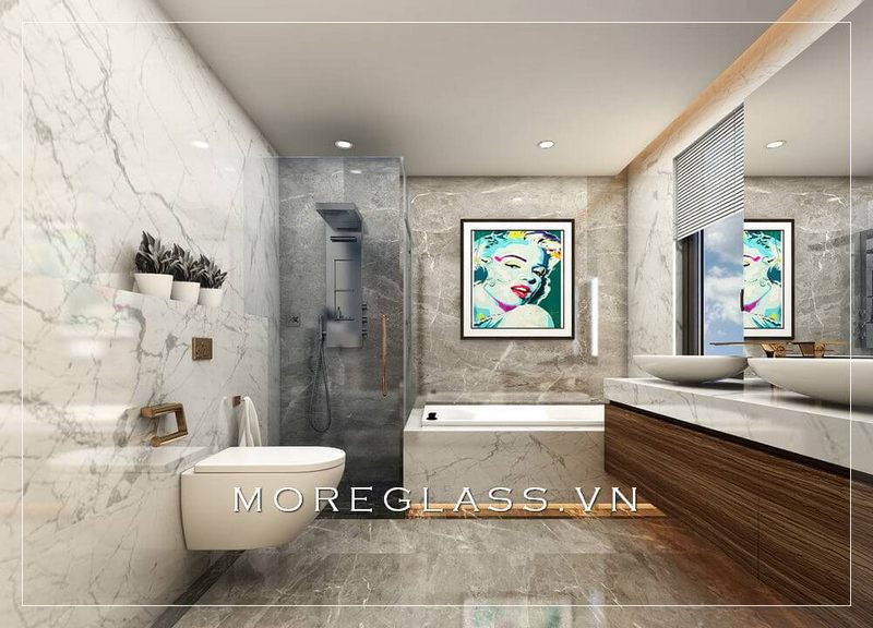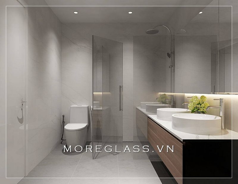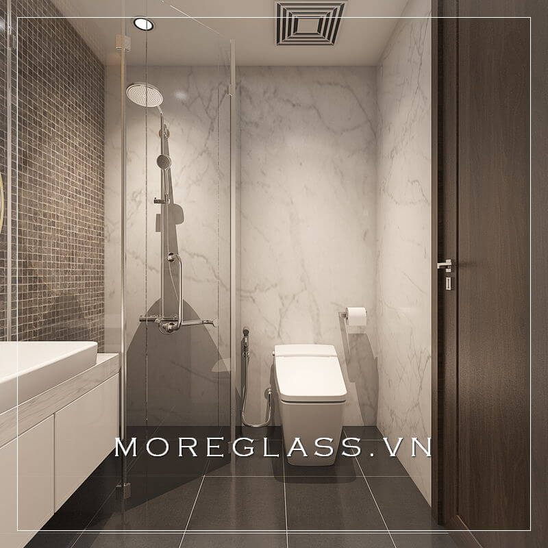 Mẫu thiết kế nhà vệ sinh hiện đại có phòng tắm kính cao cấp, cùng với thiết bị vệ sinh đơn giản và tiện nghi.