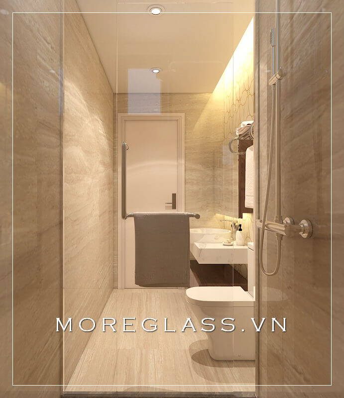 Phòng tắm của khách sạn cao cấp được thiết kế với đồ nội thất và thiết bị vệ sinh cao cấp, cùng với việc kết hợp vách tắm kính giúp tăng thêm đẳng cấp cho phòng tắm.