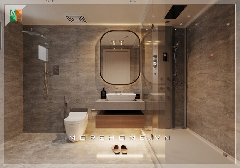 Mẫu thiết kế phòng tắm đơn giản được kết hợp với kệ tủ và các thiết bị vệ sinh cao cấp, nhỏ gọn.